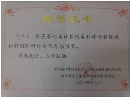 6月19日-23日,第七届计算纳米科学与新能源材料国际研讨会在南京召开,省环保重点实验室张勤芳教授指导的材料物理专业大三学生汪瑞同学发表了题目为“Study on Electronic Structures and Defect Properties of Lithium Tantalate”的文章,张勤芳教授的科研助理郑福宝发表的“Electronic Structures and Magnetic Properties of Rare-earth Metal Doped Bi2Se3”论文被大会组委评为优秀墙报。