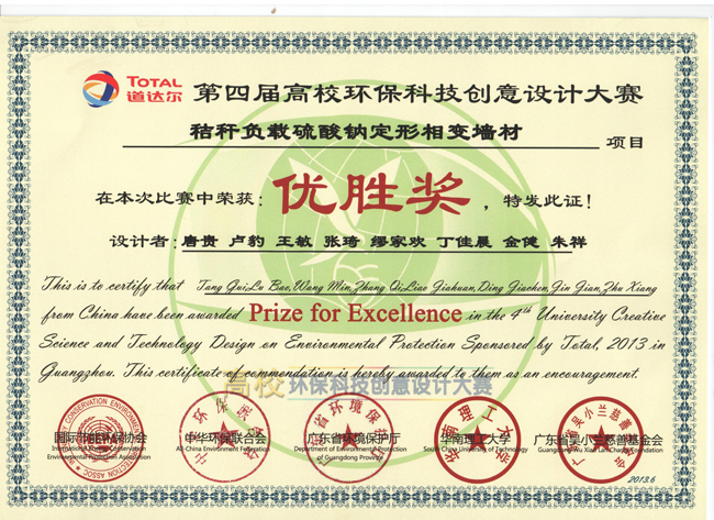 近日,在“道达尔”第四届高校环保科技创意设计大赛中,我室副主任侯贵华教授,张峰博士指导的“节能环保墙体材料设计团队”(材料学院、环境学院联合组队,唐贵(队长)、卢豹、王敏、张琦、缪家欢、丁佳晨、金健、朱祥)的参赛作品“秸秆负载硫酸钠定形相变墙材”获得优胜奖,这是我校首次在高校环保科技创意设计大赛取得突破。