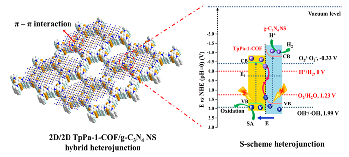 作为一种清洁能源,氢能因具有洁净、高热值、高效率和环境友好等特点,而被认为是解决能源危机和环境问题的最理想的替代能源之一。近年来,利用太阳能光催化分解水析氢受到了人们的广泛关注, 开发高效的光催化剂成为研究重点。构建具有良好界面接触、更快光生电荷转移效率以及高氧化还原能力的S型异质结被认为是提高光催化析氢性能的最有效途径之一。本文制备了具有较高化学稳定性的β-酮烯胺基TpPa-1-COF纳米片,并通过在乙二醇中超声剥离得到的g-C3N4纳米片(g-C3N4 NS),再将它们各自的纳米片分散液混合后经过油浴加热回流处理,由于TpPa-1-COF纳米片与g-C3N4纳米片两相之间的π–π共轭相互作用,制得了一种独特的二维/二维(2D/2D) S型异质结TpPa-1-COF NS/ g-C3N4 NS(TPCNNS)光催化剂。由于内建电场显著促进了载流子的分离和迁移,导致在可见光照射下,具有最佳复合比例的TPCNNS-2(TpPa-1-COF: g-C3N4 NS质量比为2:1)样品的光催化析氢速率(1153 μmol g–1 h–1),比纯TpPa-1-COF NS和g-C3N4 NS分别提高了2.8和5.6倍,而且表现出良好的光催化稳定性。总之,本文为开发具有高效析氢性能的π–π共轭2D/2D COF基S型光催化异质结材料提供了新思路。该论文受到国家自然科学基金、江苏省青蓝工程、江苏省研究生科研与实践创新计划项目等项目的经费支持。感谢盐城工学院分析测试中心提供支持。